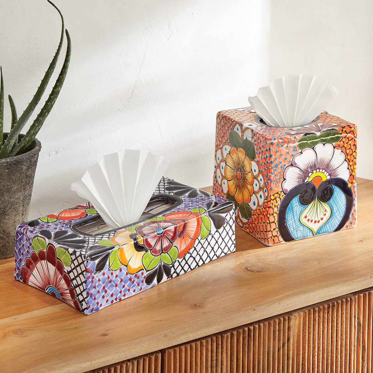Compare Add to Cart The item has been added Canyon Glow Talavera Tissue Box Cover - Square - OVERSTOCK Exclusive Item - Add a pop of color to your space with the Canyon Glow Talavera Tissue Box Cover - Square. This cover will brighten up any room while discreetly holding your tissue box.Ceramic6"W x 6"D x 6"HWipe with damp clothMulticolor finish View Details Please Select an option. Old Price $70.95 Sale Price: $44.95 44.95 Canyon Glow Talavera Tissue Box Cover - Square - OVERSTOCKQuantity: Decrease Quantity: Increase Quantity: