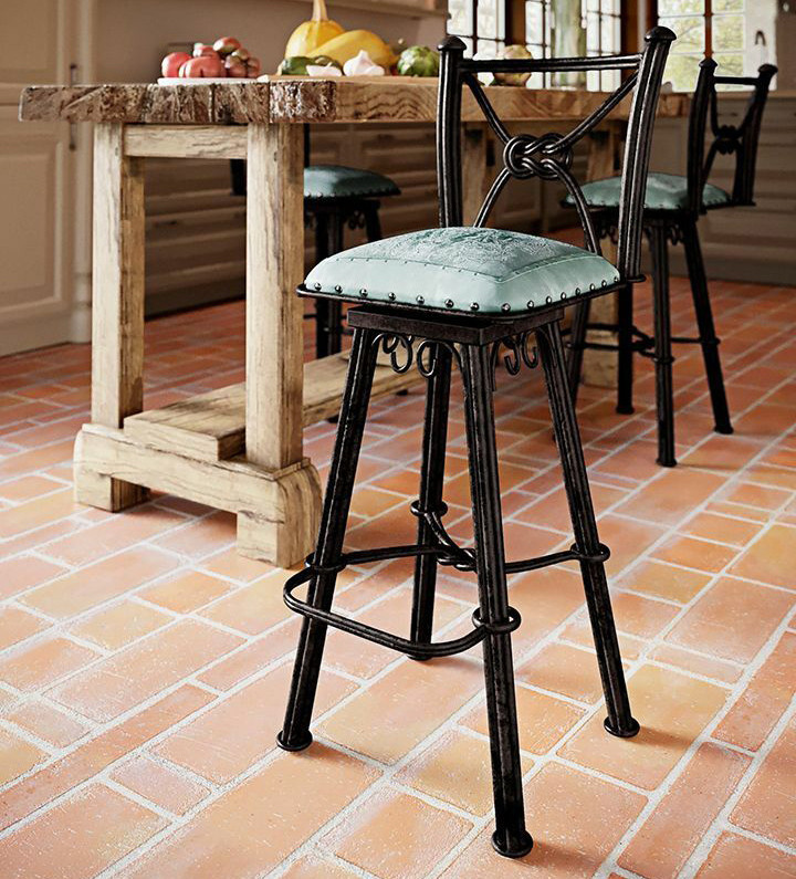 Showcase your western style with the Coronado Iron Stool with Back - Colonial Turquoise, designed with hand-tooled turquoise saddle leather on an elegant and sturdy iron frame.