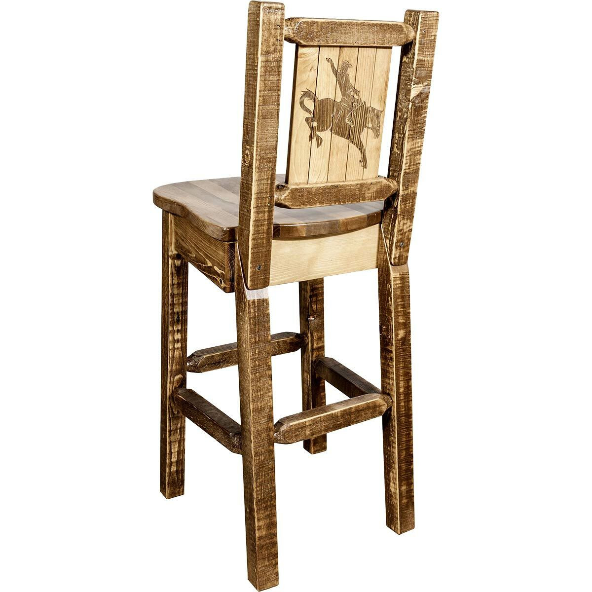 Give your bar cowboy flair with the Denver Barstool with Engraved Bronc Back, detailed with a laser engraved bronc on solid lodge pole pine construction with a lacquer finish.