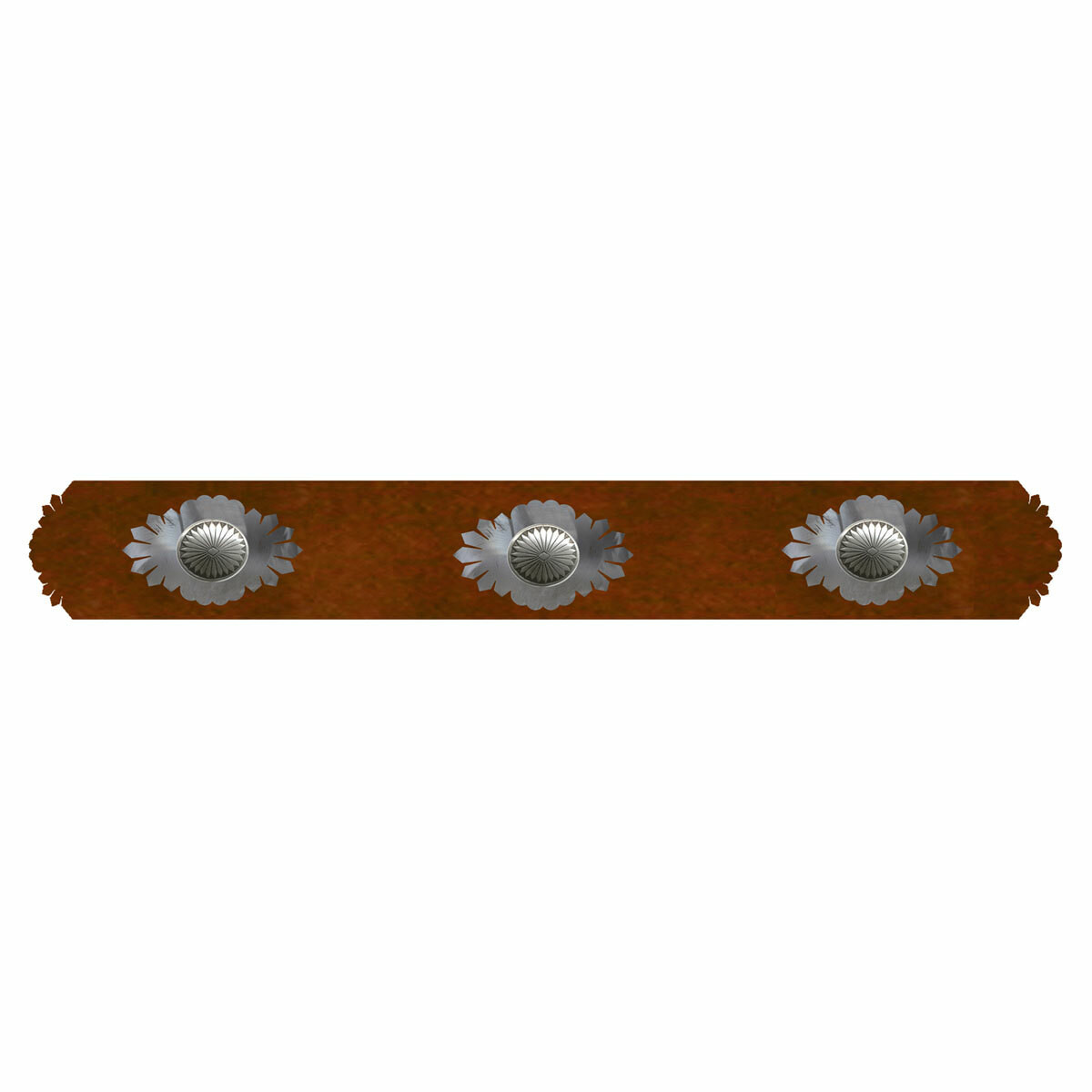 Compare Add to Cart The item has been added Desert Sun Rug Rail - 24 Inch Create effortless style in your old west family room with the Desert Sun Rug Rail - 24 Inch, beautifully made with sunburst silver conchos with a burnished southwestern underlay and detailed edges. Laser-cut rolled 16-gauge steel 27 1/2"W x 1 1/4"D x 4... View Details Please Select an option. Old Price $142.95 Sale Price: $119.95 119.95 Desert Sun Rug Rail - 24 InchQuantity: Decrease Quantity: Increase Quantity: