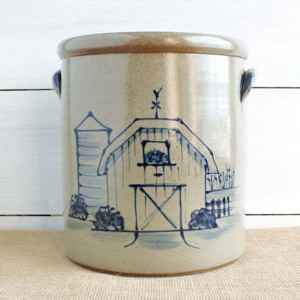The Farmyard Kitchen Accessories are antique white stoneware pieces featuring an enchanting illustration of a barn with a silo in a scenic country setting, adding both rustic charm and functionality to your farmhouse-inspired kitchen.
