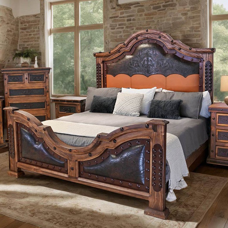 Showcase your southwestern style with the Kensington Tooled Leather Bedroom Furniture Collection, designed with handcrafted Chilean pine enhanced by tooled leather, iron trims and rivets. Handcrafted from Chilean pine with tooled leather. Finished in a dark wax to retain the natural character of the wood.