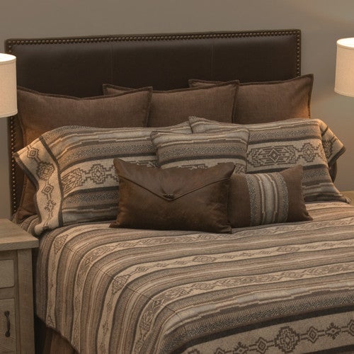 Make a statement in your bedroom with the Lodge Lux Collection, this western bedding is adorned with intricate geometrics and stripes in muted shades of brown paired with solid espresso fabric and lovely gray fox faux fur for a true rustic feel.